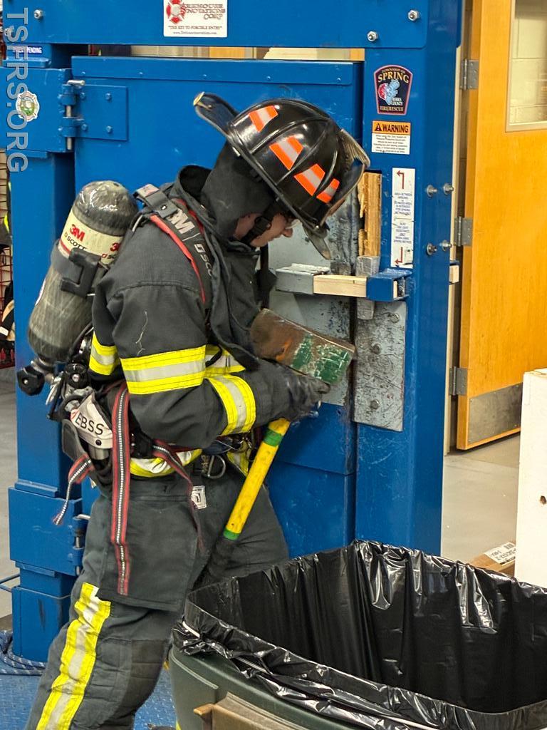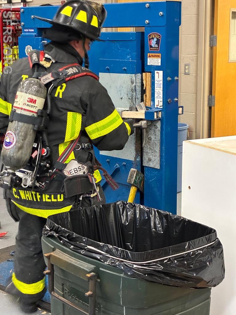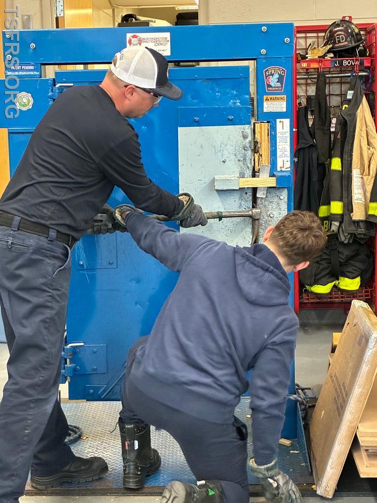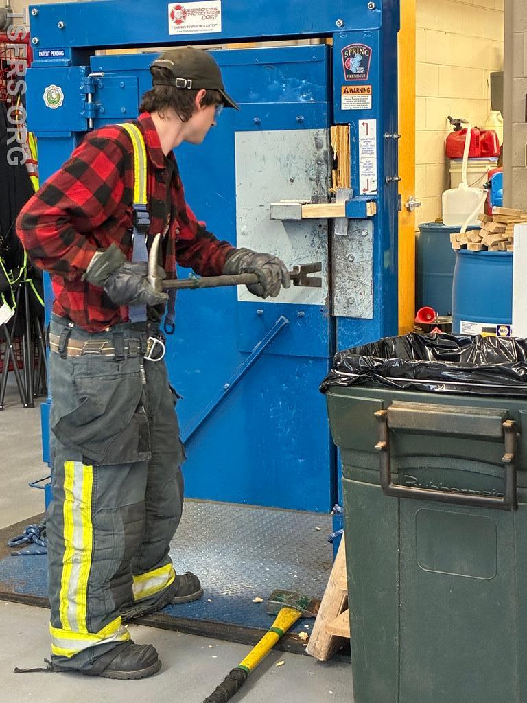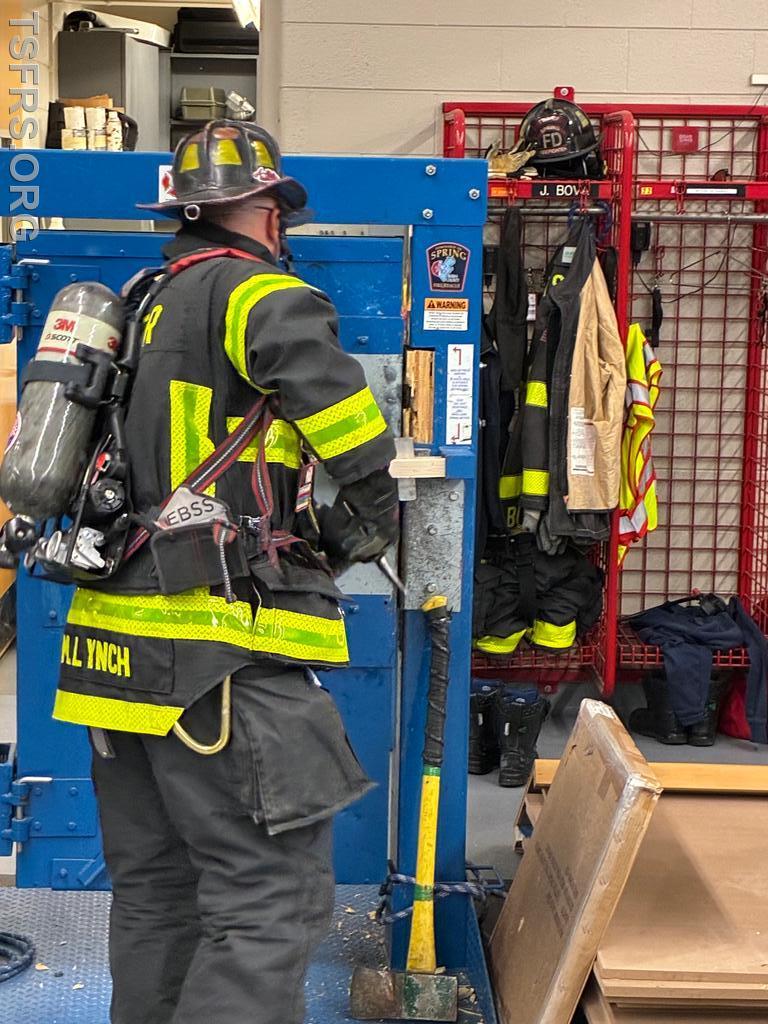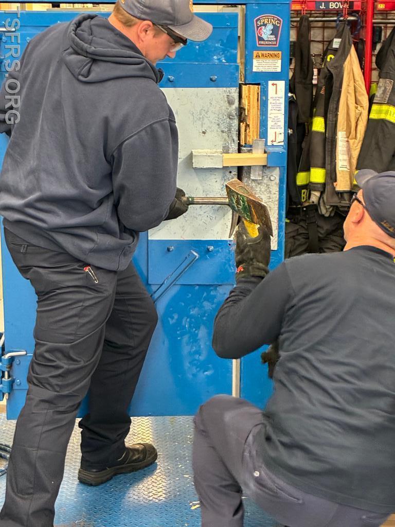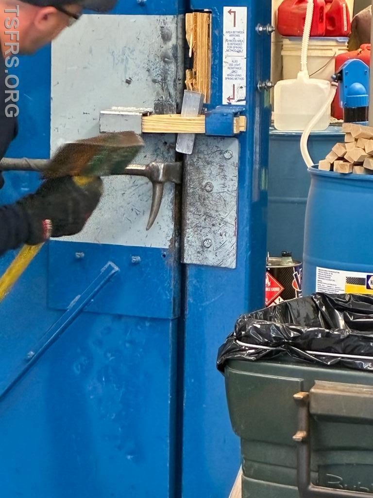 Our regular Monday night drill on April 20 focused on forcible entry operations. Utilizing the department's door simulator, members initially practiced the tasks used to breach locked doors using basic hand tools such as the Halligan bar /flat head axe combination frequently referred to in the fire service as a "marriage". After the basics, personnel donned full personal protective equipment and engaged in full speed breaching operations for doors that open both toward and away from the operator.