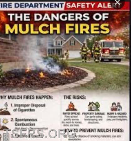 TSFRS and most other fire departments in our area are plagued by mulch fires. This sounds mundane, but these have been known to spread to nearby buildings, trees and other fuel sources. Commercial mulch piles have been known to be several stories high and hundreds of feet long and can burn for days if ignited.